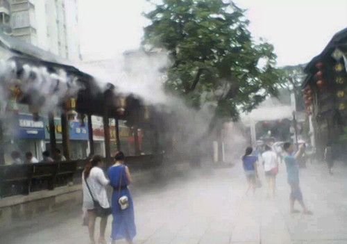 商業(yè)街商業(yè)廣場冷霧降溫產(chǎn)品全方位多功能: 降溫、造景、加濕、防塵、防靜電、除臭、消毒、噴藥、防疫、驅(qū)蟲、驅(qū)蚊.