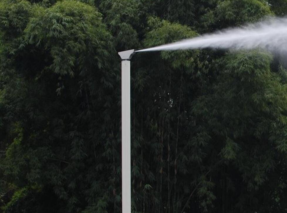 智能高壓霧樁由機(jī)頭組件、立桿組件、水路系統(tǒng)、電控系統(tǒng)四部分組成,智能霧樁可達(dá)到360°(±180°)旋轉(zhuǎn)噴霧、具有防風(fēng)、防雨、防塵等功能,滿足野外作業(yè)需求,遇高溫天氣時(shí),噴灑的霧氣可吸收空氣中的熱量,降低路面的溫度,減少人們的燥熱感。